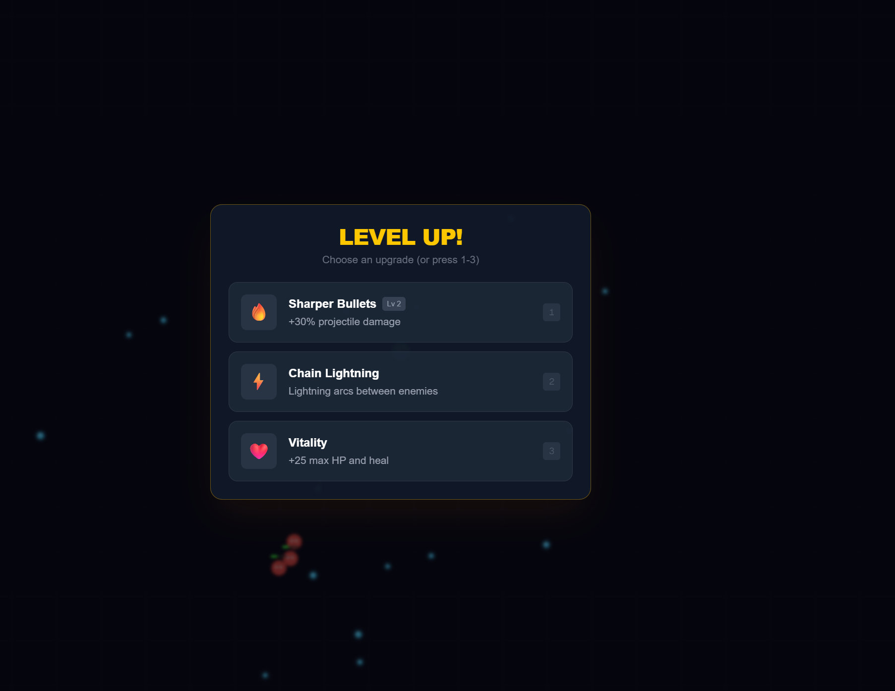 - 4 weapon types — Projectiles, Orbital Guard, Nova Blast, and Chain Lightning